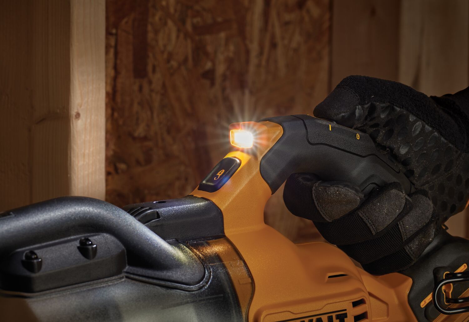 Male using DEWALT 20 MAX* Hand Vacuum with extension tube and floor nozzle accessories vacuuming up drywall, dust, and small screws on a jobsite. DEWALT 5AH hour battery is being used. LED light is powered on.